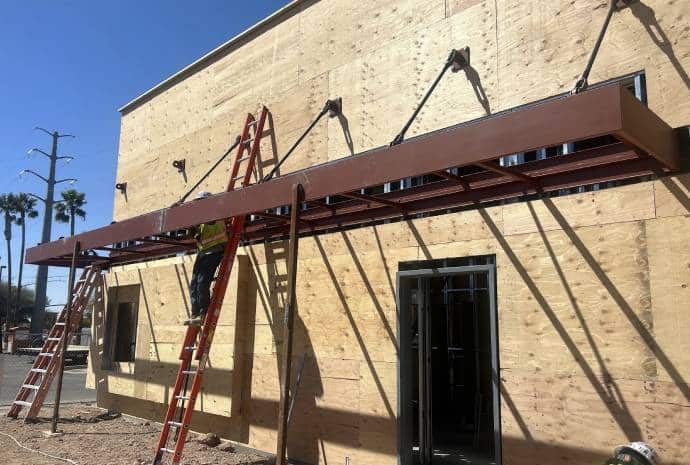 SFA Contracting offers ongoing maintenance, gutter cleaning, and repairs for commercial eyebrow sunshades, patio canopy systems, and loading dock covers. Their custom-fabricated metalwork includes aluminum front panels, ornate twisted metal accents, and powder-coated finishes to maintain its rich color and ensure long-lasting strength.